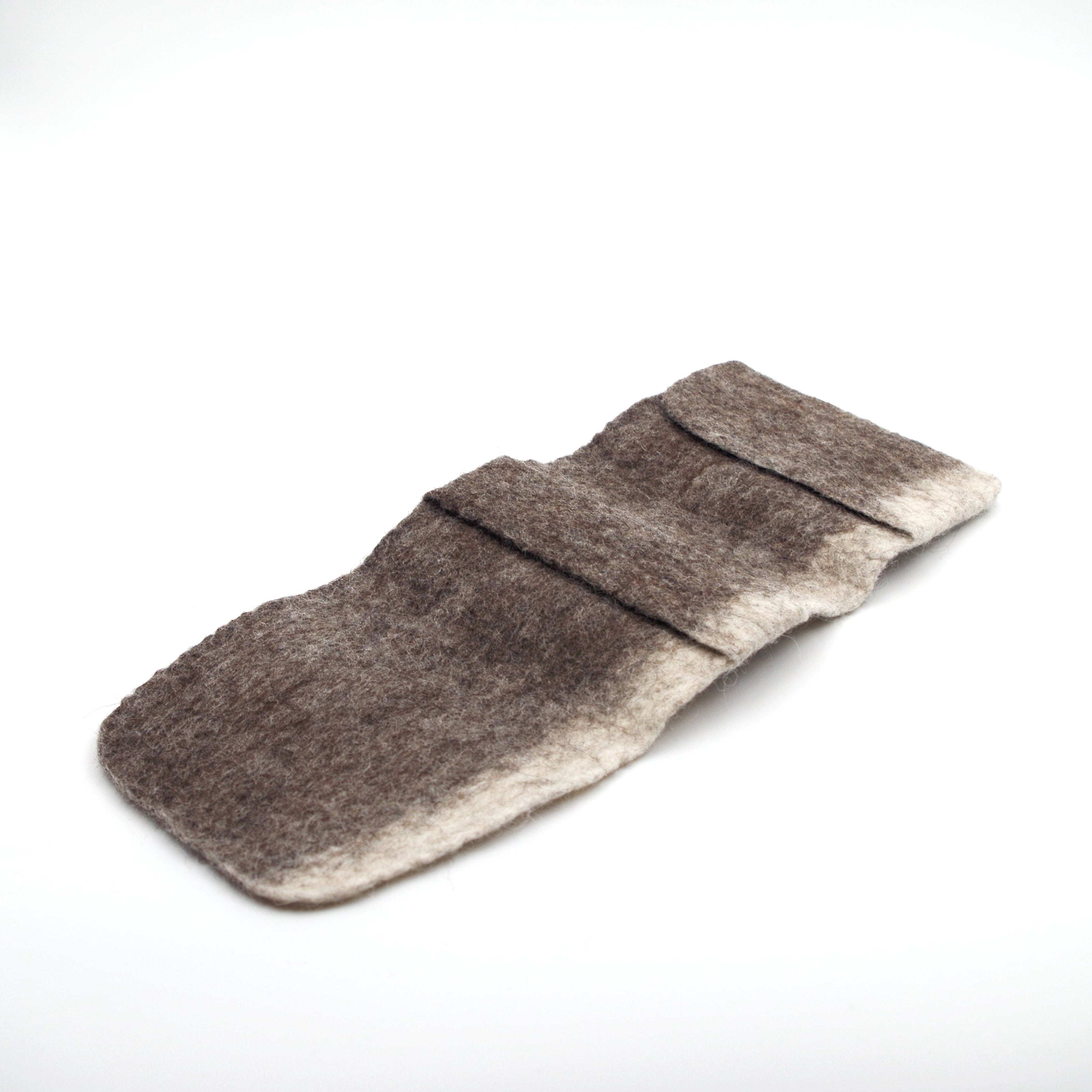 下部の2色の羊毛が混ざり合う(縮絨する)ことで生まれる風合いなどはすべて異なりますので、ハンドクラフトならではのそれぞれの個性の違いをお楽しみください。